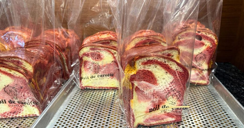 インパクトのある真っ赤なマーブル模様と、驚くほどの弾力あるもちもち食感が特徴です。軽くトーストして食べれば、周りサクサク、中はモチモチ感のダブル食感が楽しめます。
