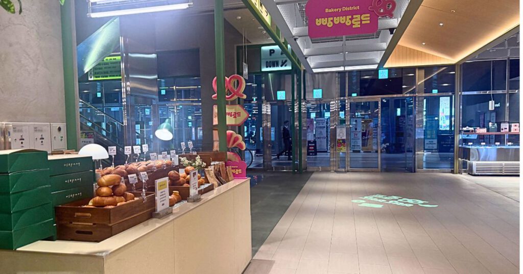 グランドフロアに広がる「パンパンストリート」は、清州内外で話題のカフェやベーカリーのテイクアウト専門店が集まるエリア。わざわざ本店まで足を運ばなくても、人気のスイーツをまとめて購入できるのが魅力です。