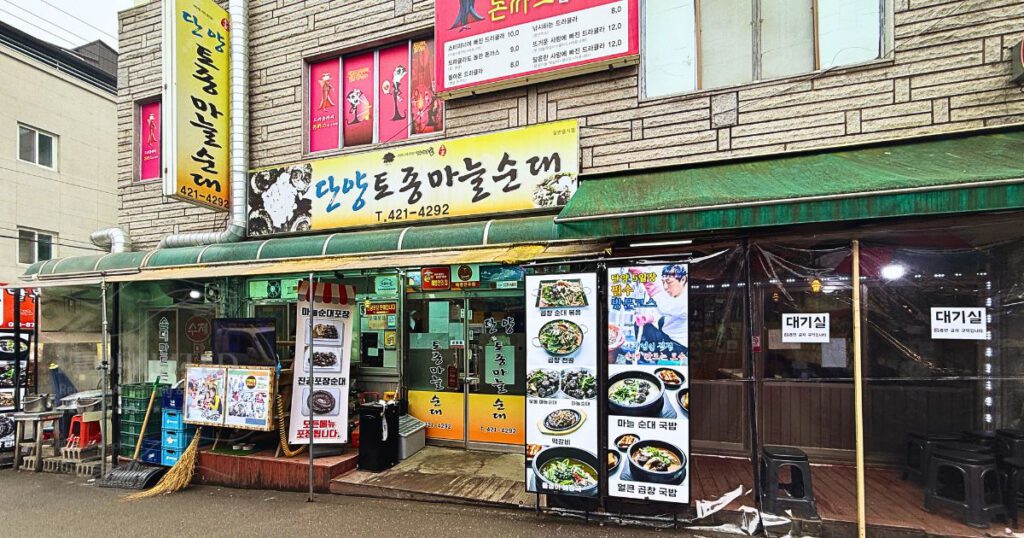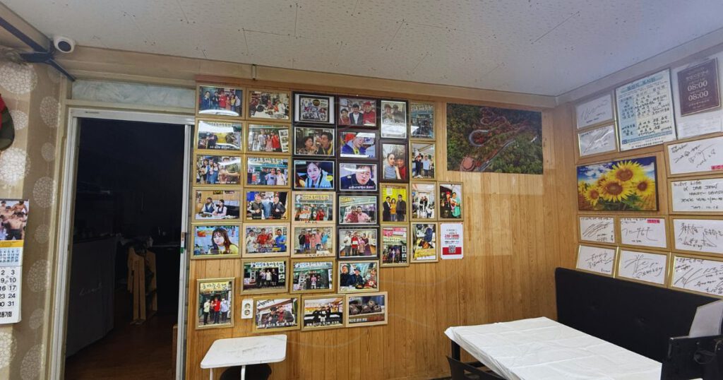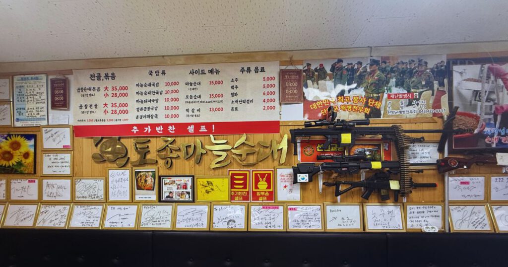 丹陽(タニャン)クギョン市場の一角に店内に단양 토종마늘순대(タニャン トジョンマヌルスンデ)は位置しています。ノスタルジックな外観の店内に一歩足を踏み入れると、壁一面に有名人のサインや写真がずらり!