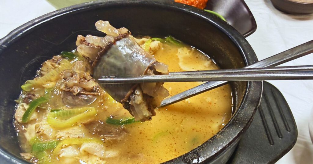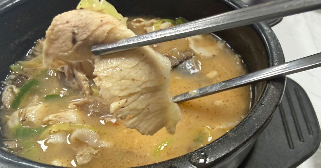さっそくお店の代表的メニュー「マヌルスンデクッパ(にんにくスンデクッパ)」を注文。注文からわずか5分ほどで、グツグツと煮えたぎる熱々の器が運ばれてきました。